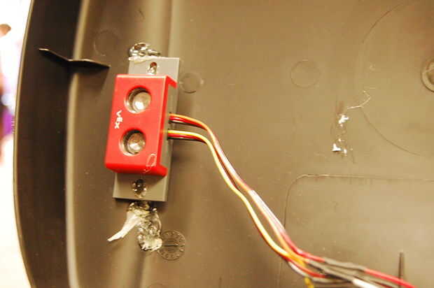 Continuación hasta es montaje el sensor para detectar el nivel de llenado en la tapa de la papelera. Utilicé un sensor ultrasónico de VEX para este proyecto que estaba fácilmente disponible, pero va a hacer casi cualquier sensor de Estados Unidos. Caliente pegué el sensor en su lugar, pero se emperna en crear un montaje permanente.