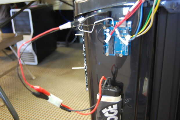 Para alimentar el Arduino sin una computadora, necesitamos montar una batería en la lata. Lo hice creando un bolsillo fuera de cinta adhesiva y caliente pegando al lado de la lata. Hay soluciones mucho más elegantes a este que se puede utilizar, y me animo a hacerlo. La batería está conectado al Arduino usando un 2,1 mm centro positivo de tapón soldado en un par de pinzas de cocodrilo. Es preferible utilizar un conector de batería real, pero no es algo que pude hacer.