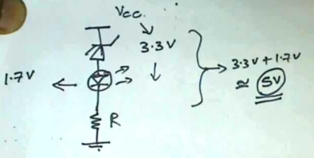 considerar el nivel de tensión al que debemos el led luz es v1 y el led de voltaje es v2 y el Diodo zener para ser seleccionados para este nivel de voltaje es = v1-v2
