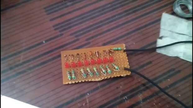 La configuración puede ser soldada en un pcb y esto puede ser cubierto con cinta de papel o cartón para proporcionar protección al circuito y también para difundir la luz llevada. los niveles de tensión pueden ser calliberated con un multímetro y estos niveles de voltaje pueden ser marcados en el indicador de voltaje.