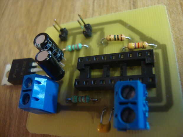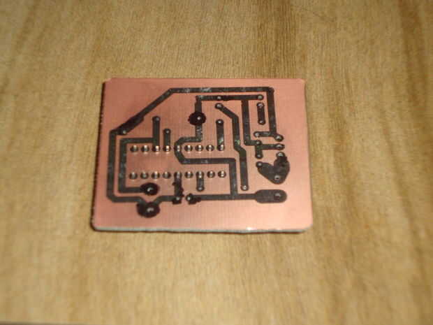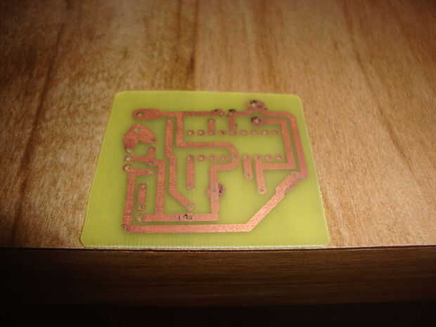 Transferir el toner a revestido con una laminadora de cobre.  Perforar y soldar los componentes.