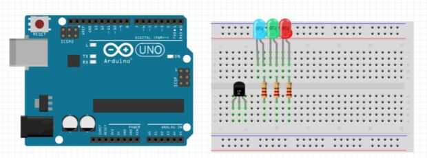 Los leds muestran a la temperatura entre 16 a 40 ° c grados.¡ Disfrute!Paso 1: Lista de piezas3 led verde2 led amarillo3 led naranja3 led rojo11 330Ω resistencia1 protoboard1 Arduino Uno1 Sensor de temperatura LM3515 cables de puente (macho)Paso 2: c
