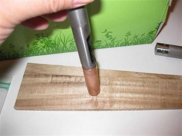 Rebabas a ambos extremos de la sección de corte de tubería con archivos - el interior y el diámetro exterior. Solía un punzón de 1/2 pulgada con un cono flare ambos extremos. Una llamarada leve ayuda a crear una buena fricción con las tapas. Las tapas están diseñadas para soldar para permanecer así que se debe modificar el ajuste para el ajuste de la fricción. Madera se utiliza para evitar daños en el extremo opuesto, cuando se quema. Tenga en cuenta el tamaño descrito para el punzón es el diámetro de agujero de sacador no el tamaño externo de acero. Otras herramientas podrían utilizar para flare los extremos, esto es lo que yo práctico.