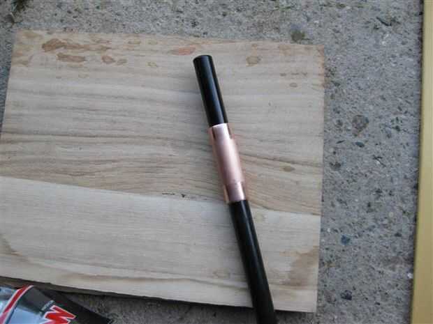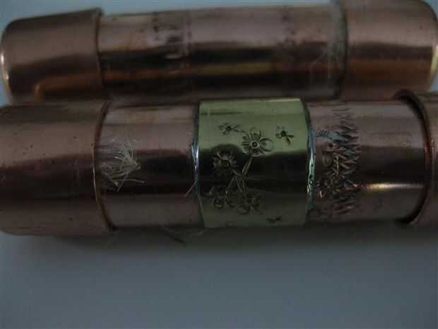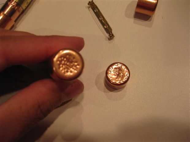 Para mantener la forma de la sección de centro durante el uso de sellos de acero decorativos; He insertado una sección de tubería de acero para que coincida con el diámetro interior. Varios metal sellado / golpes fueron utilizados para adornar la sección de centro y las tapas. Tiempo y paciencia se necesita para mantener las formas de buen ajuste. Se ha añadido una sección de tubo de cobre amarillo como decoración adicional.