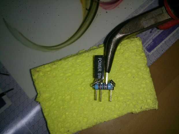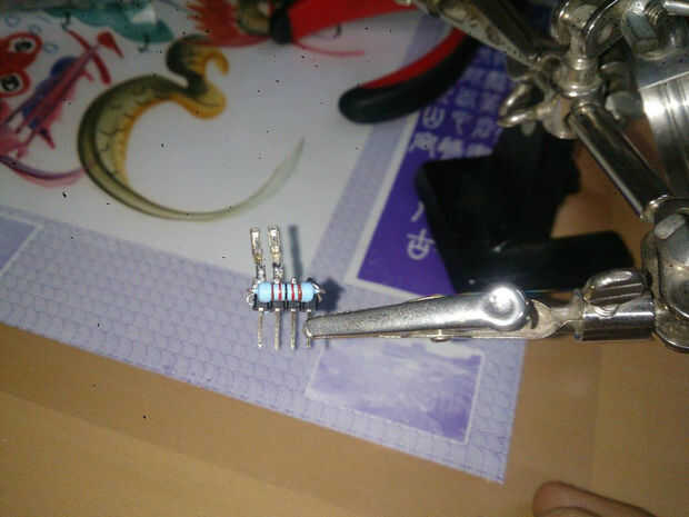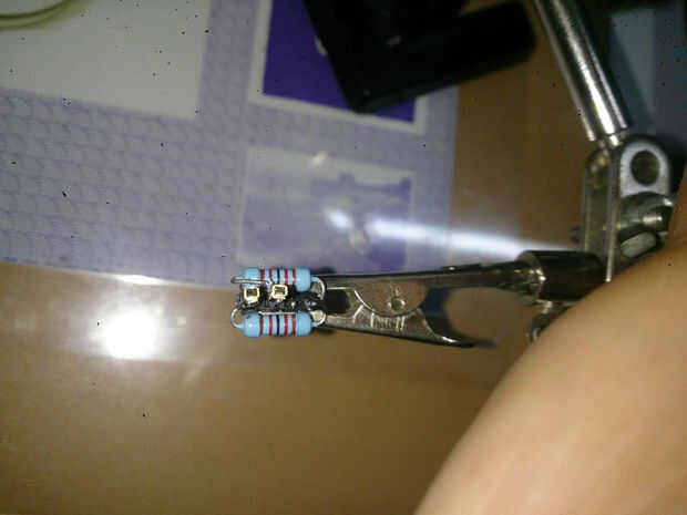 - La primera resistencia: un extremo soldado al pin 1 de la izquierda. El otro extremo al pin 4 de la izquierda.
