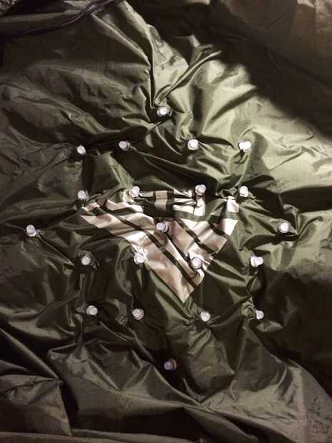 Este proyecto fue creado durante el Sprint diseño CCA rueda bien encaminado a hacer ciclistas más accesibles a los vehículos en la carretera. Utilicé un material que ya tenía que era un protector de lluvia mochila. El post completo en el proyecto se puede encontrar en mi blog. Para ello tomamos una tapa de mochila y prueba de agua LED para crear un patrón que podría utilizarse para indicar cuando el ciclista está dando vuelta derecha o izquierda. Entonces el plan era hacer una señal de última hora y una señal general para montar a caballo.