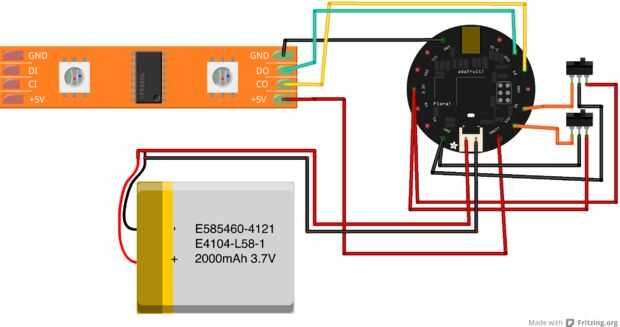 Comience por conectar el macho del conector de los LEDs. Soldar el tierra a tierra y conectar la energía a vBatt. Luego soldar las patillas de datos a D10 y el reloj a D9 en la FLORA. Luego soldar un interruptor a D12 y el otro a D6. Asegúrese de que les Conecte a tierra (pin medio en switches) así, a continuación, conectar a 3, 3V en la FLORA.