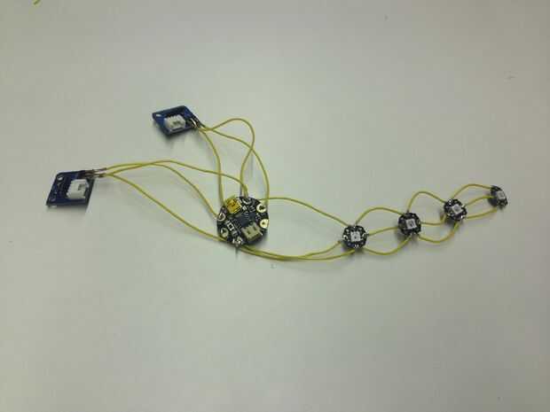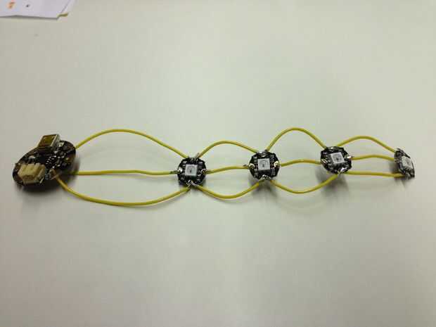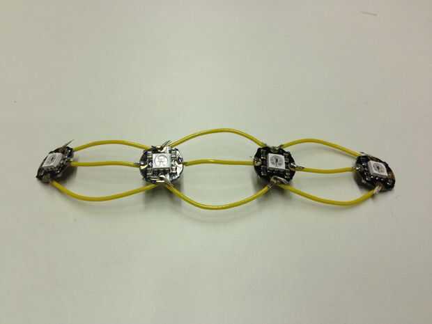 -hacer la primera línea de cables para unir los 4 leds para ver si la distancia es aceptable a partir de la flecha pequeña en el medio de cada led;