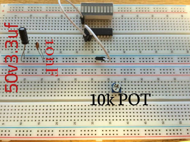 Aquí tienes el poder tira de la tablero de pan POS y NEG la 50v seguro que la polaridad es justo, entonces a continuación el 10nF. Su 10K POT un ir al otro lado de la Junta de pan.