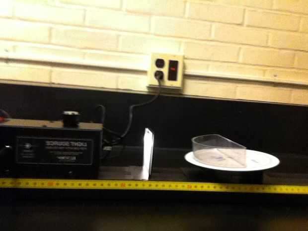 Para empezar, coloque el carril en una superficie plana y lisa. Esto asegurará que el Gatorade se mantiene estable en el envase y que la luz pasa a través del contenedor completamente. Coloque la fuente de luz en un extremo de la pista hacia el extremo opuesto. Luego, coloque la máscara de la abertura y la placa juntos unos 10cm de la fuente de luz. Esto concentrará la luz en una línea para que pueda ver donde golpea el Gatorade y cómo refracta. Poner el transportador cerca de 20 centímetros de la fuente de luz y coloque el recipiente en la parte superior. Si tienes un recipiente semicircular, debe apuntar el lado redondo hacia la fuente de luz para facilitar la lectura del ángulo en que refracta la luz.