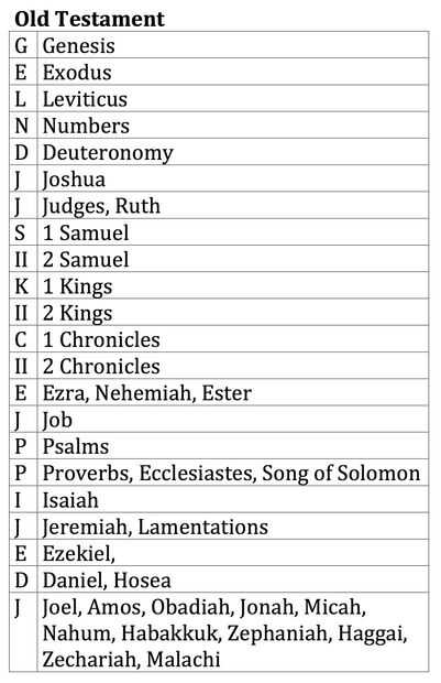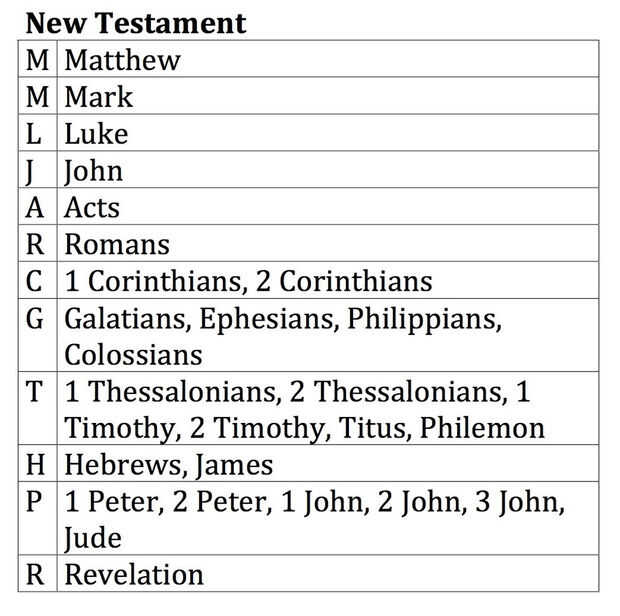 Los libros de la Biblia varían mucho en longitud así que tenemos que encontrar una manera de romper en grupos, grupos que tienen el mismo número de páginas (y espesor físico). Por lo tanto, tenemos espacio suficiente en el borde para escribir una abreviatura para el nombre del libro/grupo. Usted no puede romperlos uniformemente sin agrupar muchos libros del Nuevo Testamento, pero se pueden agrupar de una manera que tiene sentido y permite etiquetarlas. No tienes que reinventar la rueda porque ya alguien ha hecho por ti (y para mí, para el caso). En la foto, es una lista de los libros de la Biblia (en orden cronológico), agrupados de modo que el grupo es lo suficientemente grueso como para trabajar para este proyecto. La primera columna es la abreviatura que vamos a utilizar para el grupo. Si eres católico entonces esta lista es que faltan los apócrifos pero puedes leer este tutorial y luego averiguar cómo agregarlos usted mismo.