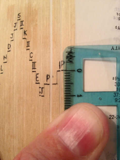 Ahora no van a querer hacer cada una de las 8 líneas verticales apiladas una pulgada largo porque quedo con el borde entero de la Biblia. Para mí, decidí hacerlos 5 mm una pieza. Elegí milímetros porque el gobernante que tenía en la mano que las fracciones más pequeñas era mi regla métrica. Que significa de arriba a abajo mi índice se ejecutará 4 cm que funciona bien.