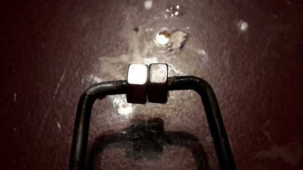 La soldadura de los extremos afilados de dos clavos y los puso a través de las tuercas. Luego doblarlas en la forma deseada