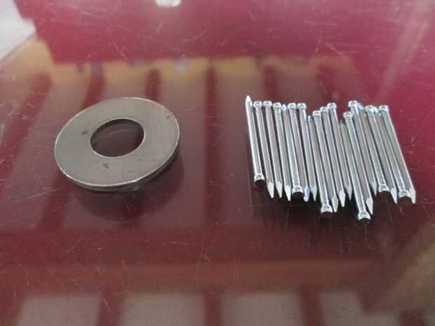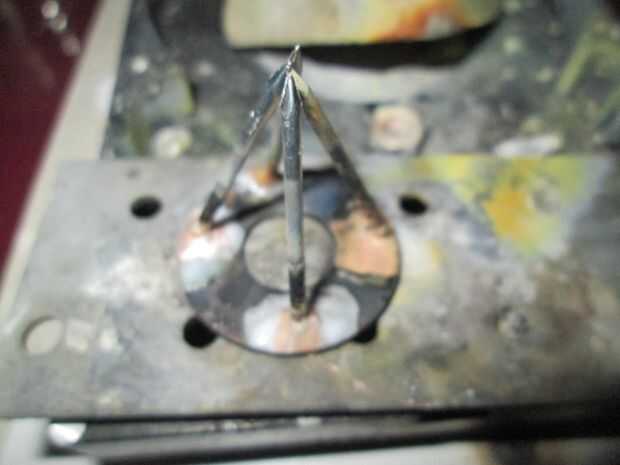 Toma un anillo de metal de 4cm de diámetro y con una separación de 1 cm en el centro. Coloque 7 clavos pequeños con habilidad dos en el borde de la "fogata" que una vez enfriada puede doblar los clavos juntos en un punto