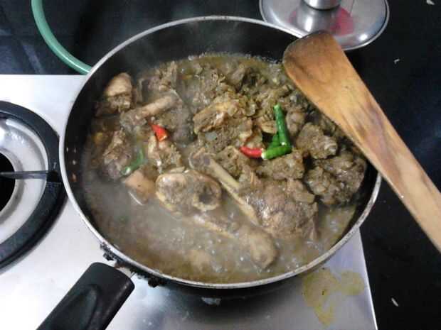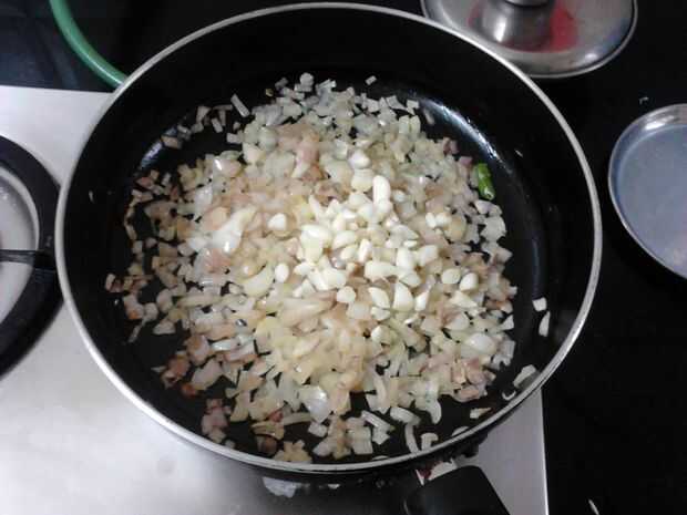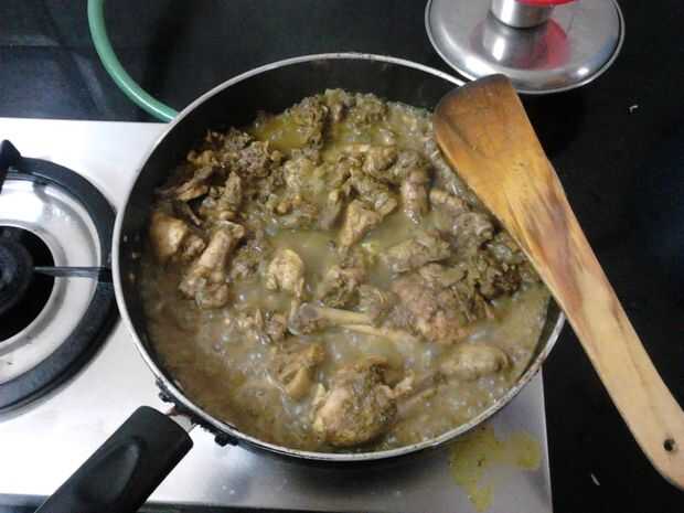 En una sartén agregar aceite de mostaza alrededor 3 tsp (pueden ser más). Calentar el aceite hasta que comience a fumar (quita la amargura). Ahora reduzca el calor y agregar la cebolla picada con una pizca de sal. Saltear hasta que estén doradas. Ahora añadir el ajo picado y cocine por más tiempo. Puede oler el sabor de ajo desde lejos. Añadir el pollo y cocinar con la tapa. Usted verá que el pollo es la liberación de grandes cantidades de agua. Esta agua cocina el pollo uniformemente. Mantener revolviendo de vez en cuando. Cuando el pollo se ve más o menos cocido, retire la tapa y deje que el agua seca. En este punto puede Agregar chiles verdes (no roto en el medio, cortar). Ahora usted puede Agregar la marinada restante si cualquier restante en la bandeja mezcladora. Añadir 1 cucharadita de comino molido y 1 cucharadita de polvo de cilantro y cocinar por 2 minutos. Añadir el agua.