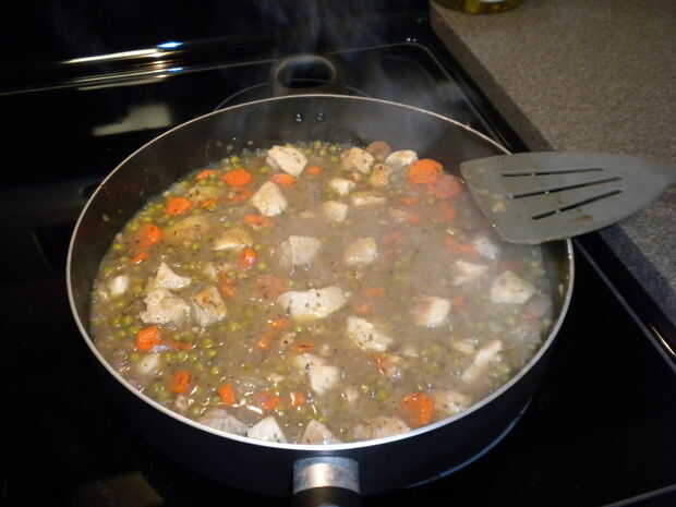 revolver constantemente hasta que se espesa el caldo. Pimienta al gusto y apague la estufa, pero no retire la sartén del calor.