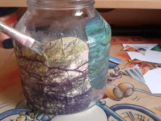 Jetzt kannst du das Glas mit dem Klebstoff bestreichen und nach und nach todos deine motivo aufkleben. Kleber der soll auch über die Bilder gestrichen werden (der Kleber trocknet klar).