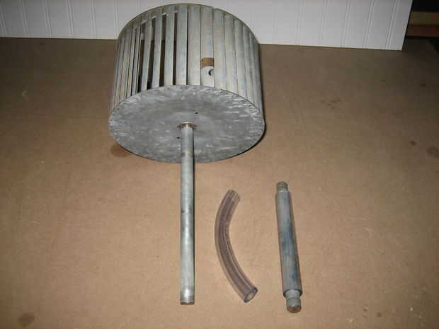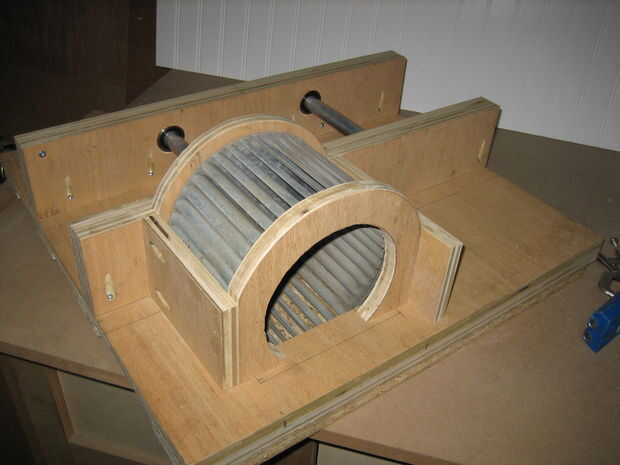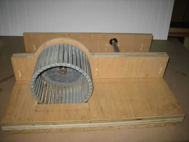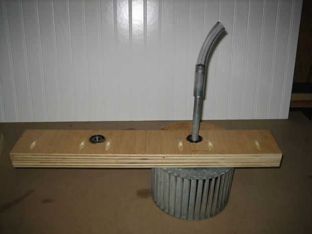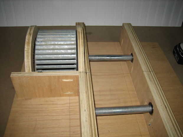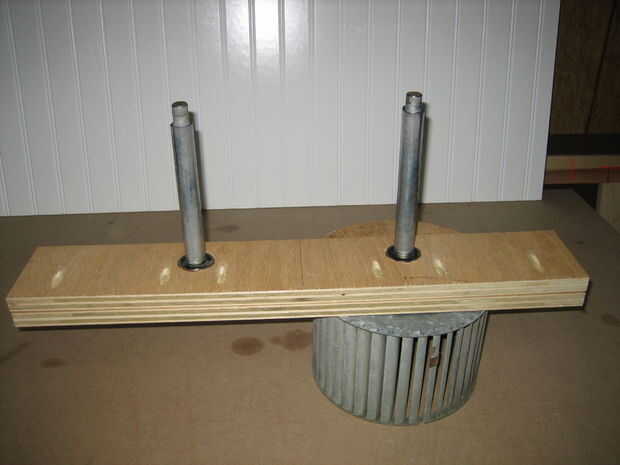1. Corte una pieza 24" largo y altura suficiente para acomodar el diámetro de su ventilador más aproximadamente 1/2" para espacio de aire. Alinee con el soporte de rodamientos y marca el eje y el cojinete de centro donde irá el ventilador. Perfore un agujero lo suficientemente grande como para el árbol ir a través.