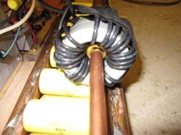 El inversor, que te mostré antes, toma de CC de alto voltaje y chuletas en alterna valores altos o bajos. Esta onda cuadrada alterna pasa a través de este transformador de acoplamiento mediante los interruptores del mosfet y el C.C. acoplamiento de condensadores en el inversor. La tubería de cobre del condensador de tanque recorre este lo que es el sola vuelta secundario de un transformador. Esto, a su vez, permite la tensión caminado desplegable atraviesan el condensador del tanque y trabajar la bobina (el tanque LC).