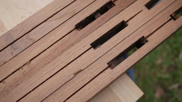 A continuación, cortado los agujeros mortaja vieja en la parte superior de los largueros y corte mis rieles transversales en 300 mm. (11,8 pulgadas)