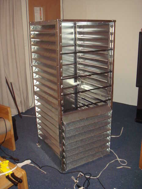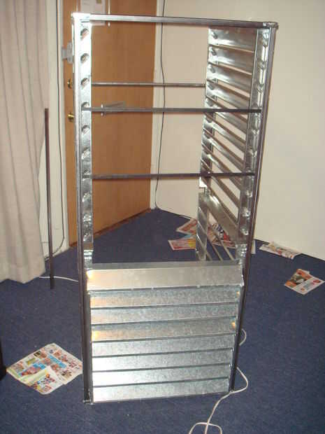 Luego, fije la primera rejilla de gable (2.5 x 2 pies) a la parte frontal inferior del marco, adentro hacia fuera (ver figura 1). Atornille los tubos cada pocas pulgadas en ambos lados. Ahora, instale las otras cuatro persianas dos a un lado, a partir de la parte superior de la torre. Superpuesto las rejillas donde conecta, esta es una elección puramente estética.