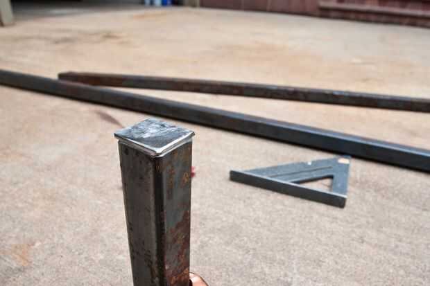 Inglete ambos extremos de la 48" pieza y un extremo de 8" piezas para que cuando usted soldar juntos, no tienes ninguna de las aberturas expuesta. Para los extremos abiertos de las piezas cortas, tapa con algunas piezas cuadradas de acero. Hice mía de una pieza de 2" de acero del ángulo, pero hará cualquier tipo de placa, siempre y cuando sea lo suficientemente gruesa como para soldar.