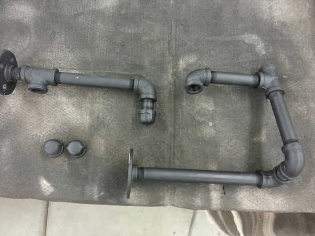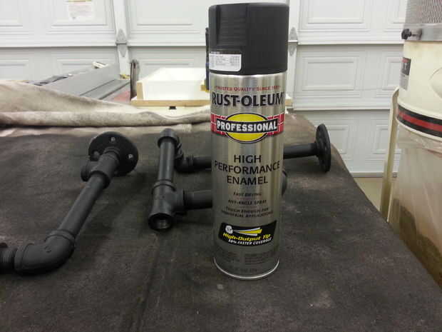 Aerosol pintada con una imprimación y la capa superior de esmalte negro para tubos.  Roció la tubería secciones montadas tan completamente como sea posible para evitar que la pintura se acumulan en hilos que pueden haber sido problemáticos durante el montaje posterior.  Este método de pintura funcionó bien.  Tomó varias sesiones para cubrir completamente todas las partes de la tubería con buena capa de pintura.