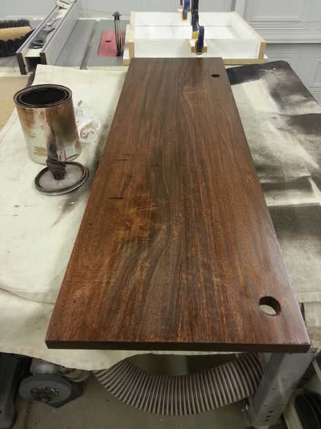 Después de dejar que la mancha seque por 24 horas, apliqué la capa transparente (barniz del mástil) con un cepillo de cerdas naturales. La durabilidad de la pintura para barcos es excesiva para estos estantes, y el acabado era muy temperamental a aplicar. Probablemente sería utilizar un aceite que yo podría se aplicado más simplemente con un trapo, me habría dado mejores resultados y más fácil de retocar en el futuro si lo hizo de nuevo. La capa clara tomó varias sesiones a aplicar.
