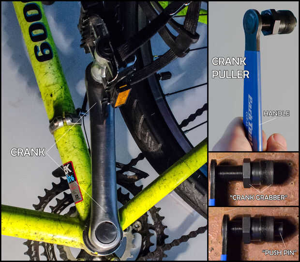 Manivelas se unen a la bicicleta por ser atrapada en los extremos cónicos del "huso" (o árbol) que pasa por el centro de un eje de pedalier. Está enclavada sobre los medios que son difíciles de bajar sin una herramienta especial llamada un extractor inestable. Eliminar una manivela sin un extractor inestable sería como tirar un clavo de una tabla con las manos en lugar de un martillo o palanca.