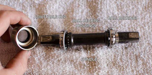 Básicamente, hay dos conjuntos de rodamientos de bolas. Los rodamientos de bolas caben generalmente en algún tipo de soporte del cojinete de plástico. El conjunto de la izquierda de rodamientos acabará atrapado entre la Copa ajustable y el lado izquierdo del husillo. El conjunto de la derecha de rodamientos acabará atrapado entre la Copa fija (que está todavía en su bicicleta) y el lado derecho del eje.