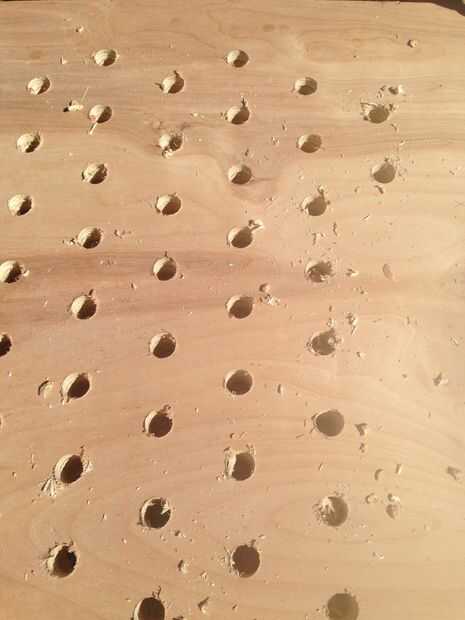 4. Perfore los orificios con una 13/16 broca. Tiene madera de desecho debajo para no destruir su real madera contrachapada soplando a través de la parte inferior. Uso un taladro de pie sean los agujeros perfectamente perpendicular y no en ángulo.
