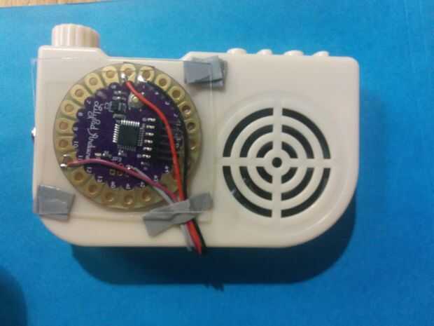 2) recoger en uno de los botones/conmutadores (sólo se puede elegir un sonido) y el cable a una placa Arduino LilyPad para bucle pulsando el elegido cambiar cada 40 minutos para mantener la cosa va para siempre.