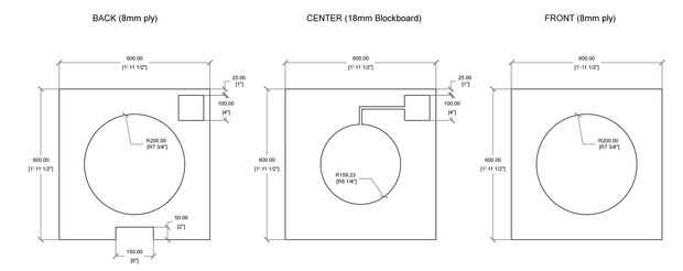 - 1 pieza de 18mm-tablero del bloque (600 x 600 mm) - necesita ser cortado según el esquema de arriba. Por favor tenga cuidado con el círculo, la circunferencia debe ser exactamente de 1000mm para que los 60 LEDs encajen correctamente. Lo conseguí de un carpintero y redondea el radio de 159.23 160 - así que tuve que usar cinta doble cara espuma los LEDs queden bien