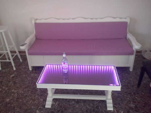 Como se puede ver cuando las luces están apagadas se parece a una mesa de centro superior de vidrio normal! el ledstrip tiene microcontrolador de control remoto para que pueda encender y apagar y cambiar colores!