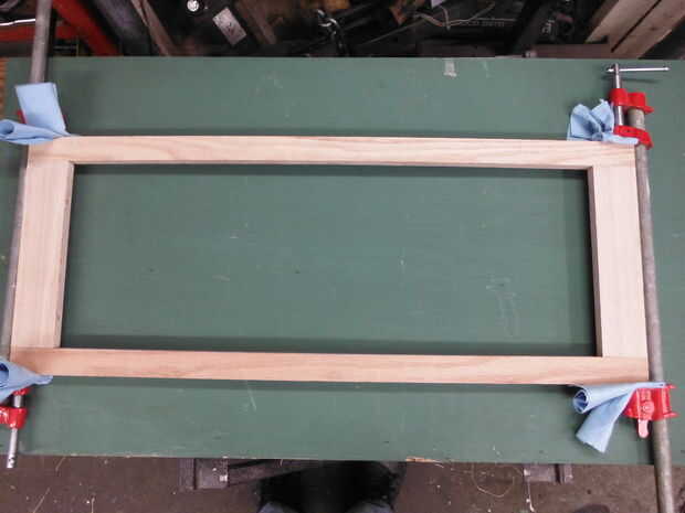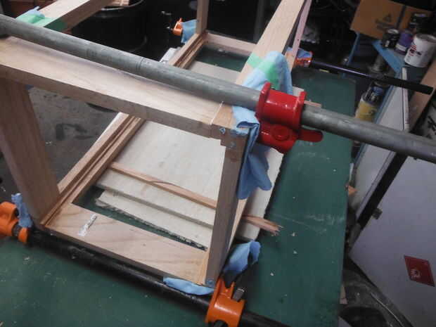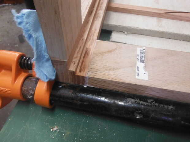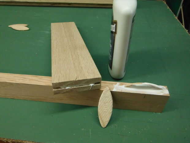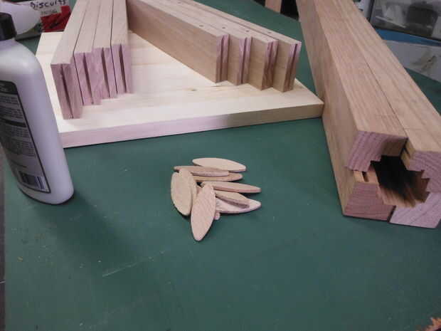 Asegúrese de tener todo que lo necesario antes de siquiera abrir el pegamento. Se necesita una superficie plana, galletas, pegamento, pinzas y una toalla húmeda o un trapo. Será más fácil pegar de un lado a la vez; luego se unen las dos mitades. Colocar las piezas en la orientación correcta. Ahora es el momento para mover un poco más rápido. Cometí el error de usar algunos fraguado rápido pegamento tenía mano, acortando el tiempo para calibrar las piezas de moldeo. Te sugiero usar uno diseñado para la fabricación de gabinete, o simplemente viejo pegamento de madera.
