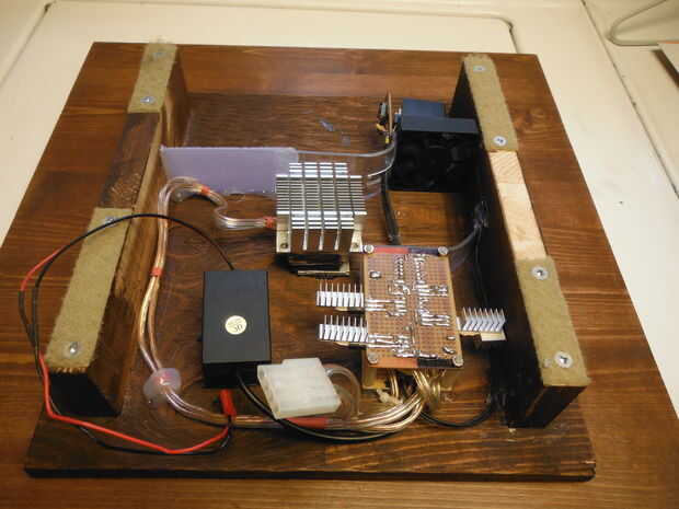 Segundo efecto de la iluminación es una palmera de fibra óptica de estilo años 70. Groovy! Montado sobre una base teñida de placa de oscuro - casi negro-madera con un agujero para la espiga para caber a través de. Está iluminado por una 3 Watt RGB-LED directamente debajo de la espiga (centro). Se ejecuta un simple mezclador RGB aleatorio basado en Arduino. Puede ver el controlador de color a la derecha y el inversor de 12v EL alambre a la izquierda. En la esquina superior izquierda se puede ver un ventilador y pasado que es un regulador de voltaje 5v/5amp. (Me gusta overkill >. >) Solo tira un amplificador, dar espacio para la expansión futura; hay un cable de 5v ocultado bajo la tapa. Otra razón que elegí fue chupar un regulador masivo es una caja "sellada", con circulación de aire mínima. Necesitaba los amperios con calor mínimo. Usé el ventilador y doblado algunos repuesto acrílico para administrar el flujo de aire. Dibuja el aire mediante el regulador de color y el disipador de calor LED entonces pasado el regulador de voltaje, regresando al otro lado para mantener el aire fresco y de circulación. No son perfectos pero ha estado trabajando muy bien.