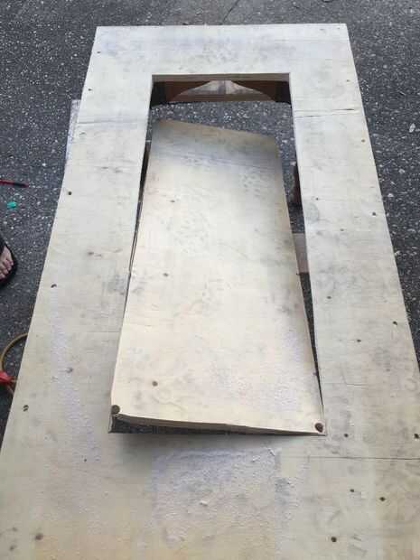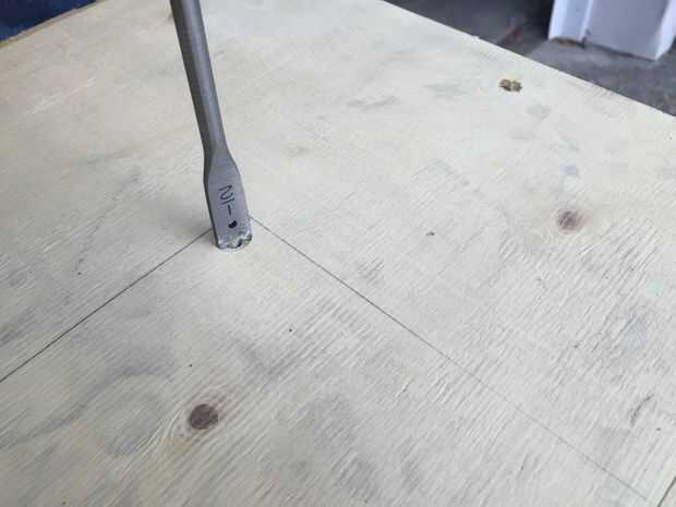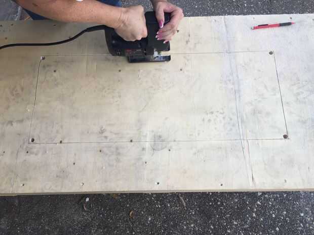 Tomé los espejos cortados y puso sobre la mesa y mide el espacio deseado en la tabla que finalmente sería casa de los espejos. Procedí a taladrar los agujeros en las cuatro esquinas de la zona que fue a cortar antes de utilizar una sierra de calar para terminar cortar el agujero. Después de cortar la tabla, lijar los bordes de la zona recién vaciado.