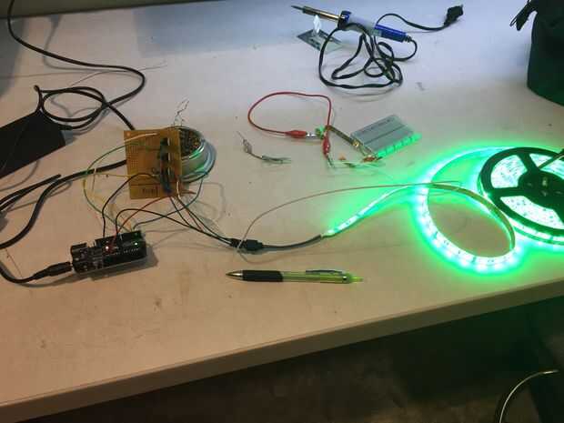 Aseguró el protoboard y ardunio en la parte inferior de la tabla, luego he conectado los cables de la tira de LED con Arduino y soldar el cable de la Arduino a la estructura de aluminio por debajo para hacer táctil capacitiva.