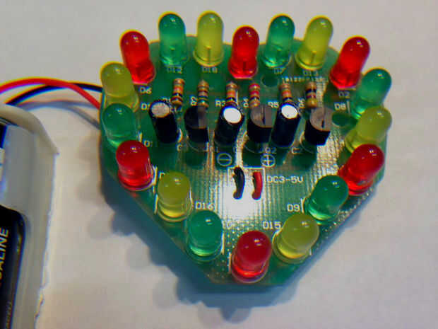 Termine, instalar dos baterías de AA de la batería y ver los LEDs uno a perseguir alrededor del corazón.
