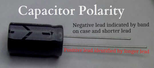 Todos los condensadores son el mismo (22uF) por lo que uno va donde no es una preocupación. Sin embargo preste atención a la polaridad (positiva y negativa) que está marcado en el tablero. Como con LEDs, el cable más largo de un condensador es positivo. Los condensadores también se marcan con una banda vertical de color en la etiqueta que corresponde al cable negativo . (véase el cuadro arriba)