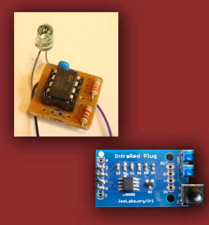 El emisor necesita un temporizador 555 para enviar a 38kHz, y puede encontrar los esquemas en todas partes, en jeelabs.org, pero también aquí: