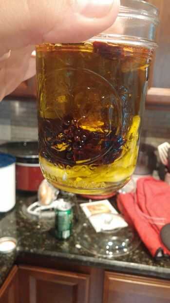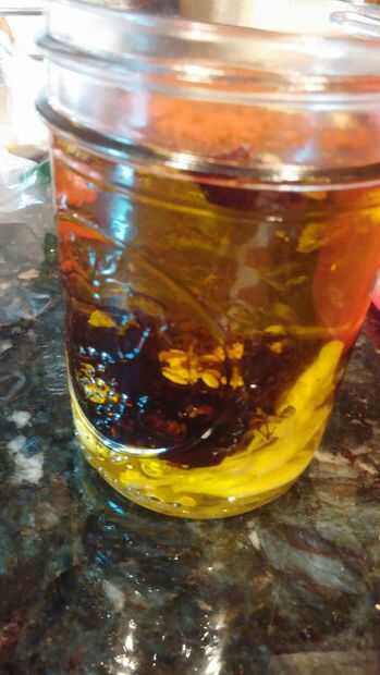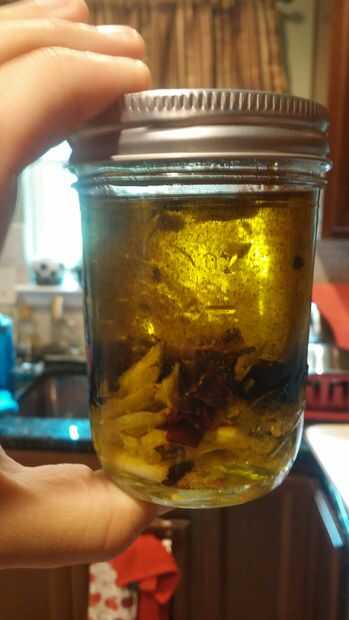 Coge un tarro de cristal y vierta en el aceite. Añadir todo que cortes, y una pizca o tres de las especias. Remover todo un poco y enroscar la tapa. Todo debe establecerse ahora, así que ponerlo en algún lugar fresco y disfrutar!