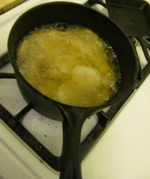 Para profunda freír las virutas, lanzar en un solo ensayo chip y encender el quemador. Cuando el chip comienza a chisporroteo y flotante, puede Agregar en el resto de las fichas. Puede que necesite varios lotes, pero asegúrese de que el aceite es no mayor a medio camino en la olla y de virutas es no superior a 3/4 en la olla. Esto (ojala) para evitar que se derramen.