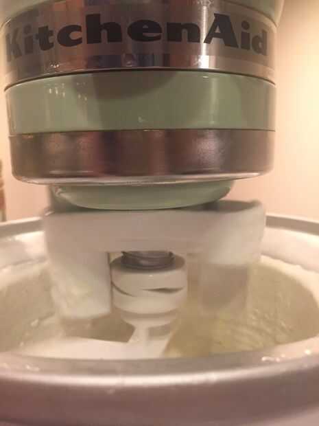 • Vierta la mezcla en su opción de helado (yo uso el accesorio de helado para mi batidora KitchenAid) y mantequera hasta que espesa y cremosa