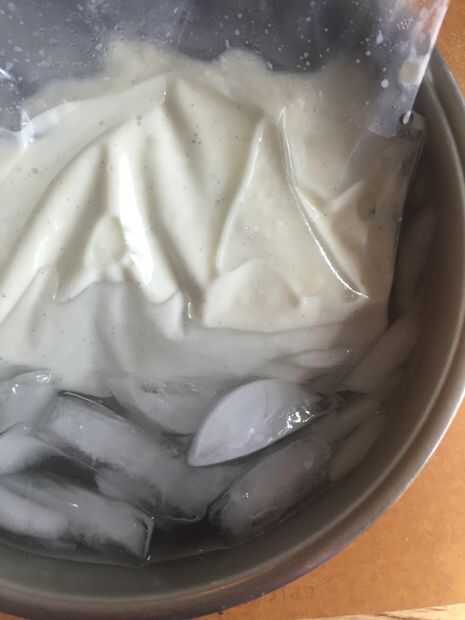 • Poco a poco batir la mezcla caliente en el queso crema luego Vierta en la bolsa del congelador y colocar en el baño de hielo hasta que se enfríe.