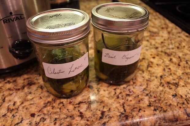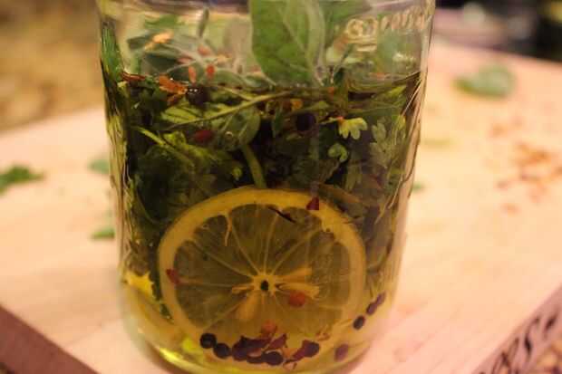 Hice 2 diferentes infundido aceites. Una noche de spaghetti y otra para noche pollo/tacos. Naturalmente, el aceite de espaguetis principalmente está llena de hierbas que van bien con los espaguetis; tales como orégano, albahaca, ajo etc.. El otro tarro para taco noche contenida cilantro, ajo, limón, pimiento rojo etc. las escamas.