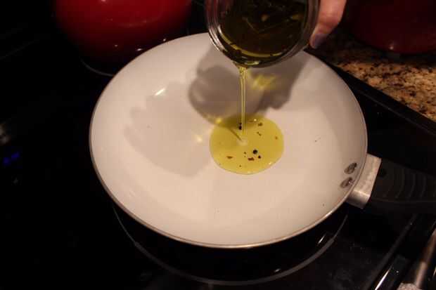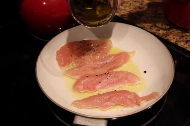 Mientras tanto, la línea una sartén grande con algunos el aceite especial que solo infunde; unas 3-4 cucharadas. Yo estoy eligiendo el cilantro aceite... calor por 1 minuto. Luego trazar tus filetes de pollo, cocine en medio alto unos 5 minutos por cada lado o hasta que la temperatura interna es de 184 grados.