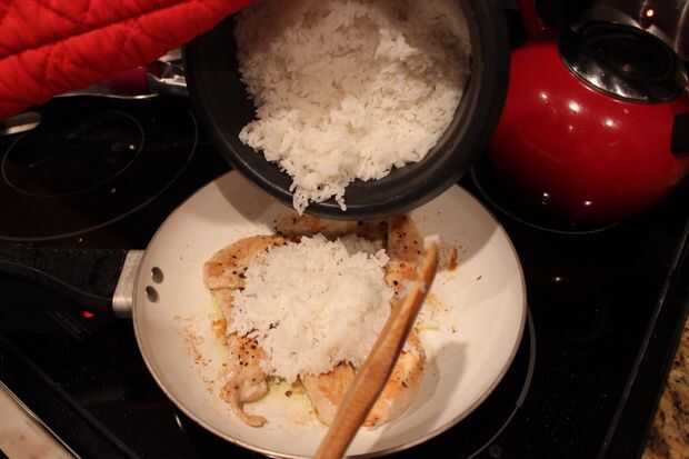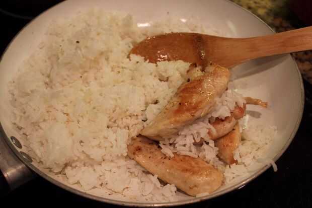 Cuando el arroz esté completo, tomar algunas cucharadas colmadas de arroz en la sartén. Mezclar junto con el pollo.