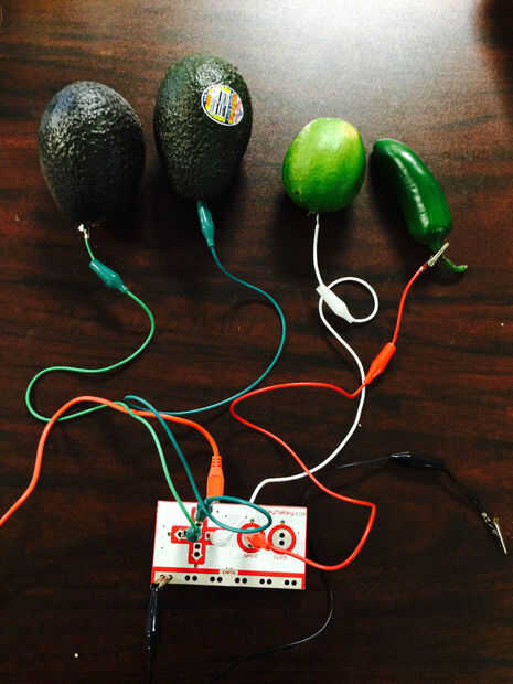 • Incrustar un lado de una pinza de cocodrilo en el componente de guacamole futuro (es decir, aguacate) y el otro lado de una pinza de cocodrilo a las entradas de Alex Junta.