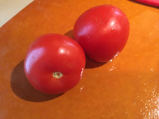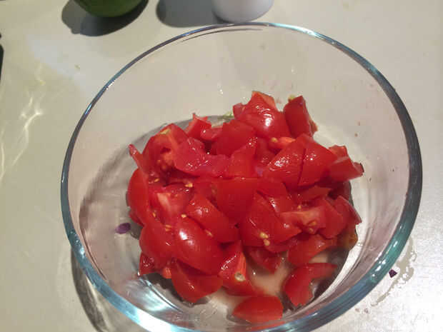 Aproximadamente picar dos tomates. Si los tomates son especialmente jugosos, dejar los líquidos (si es posible) en una tabla de cortar. Añadir los tomates picados al aguacate, la cebolla y la mezcla de jalapeño.